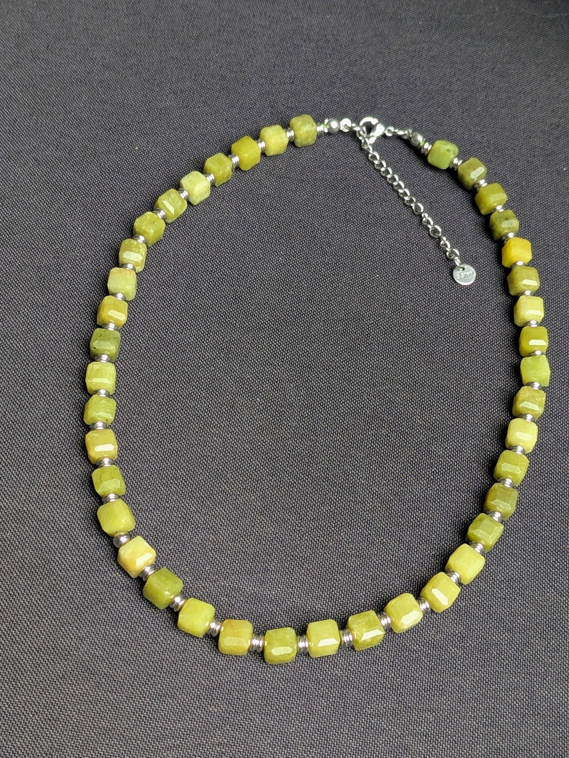 Ce collier ras de cou est composé de perles carrées de serpentine de 7 mm, aux nuances naturelles de vert doux et apaisant. Les perles intercalaires et apprêts en acier inoxydable apportent une touche lumineuse et une finition élégante.