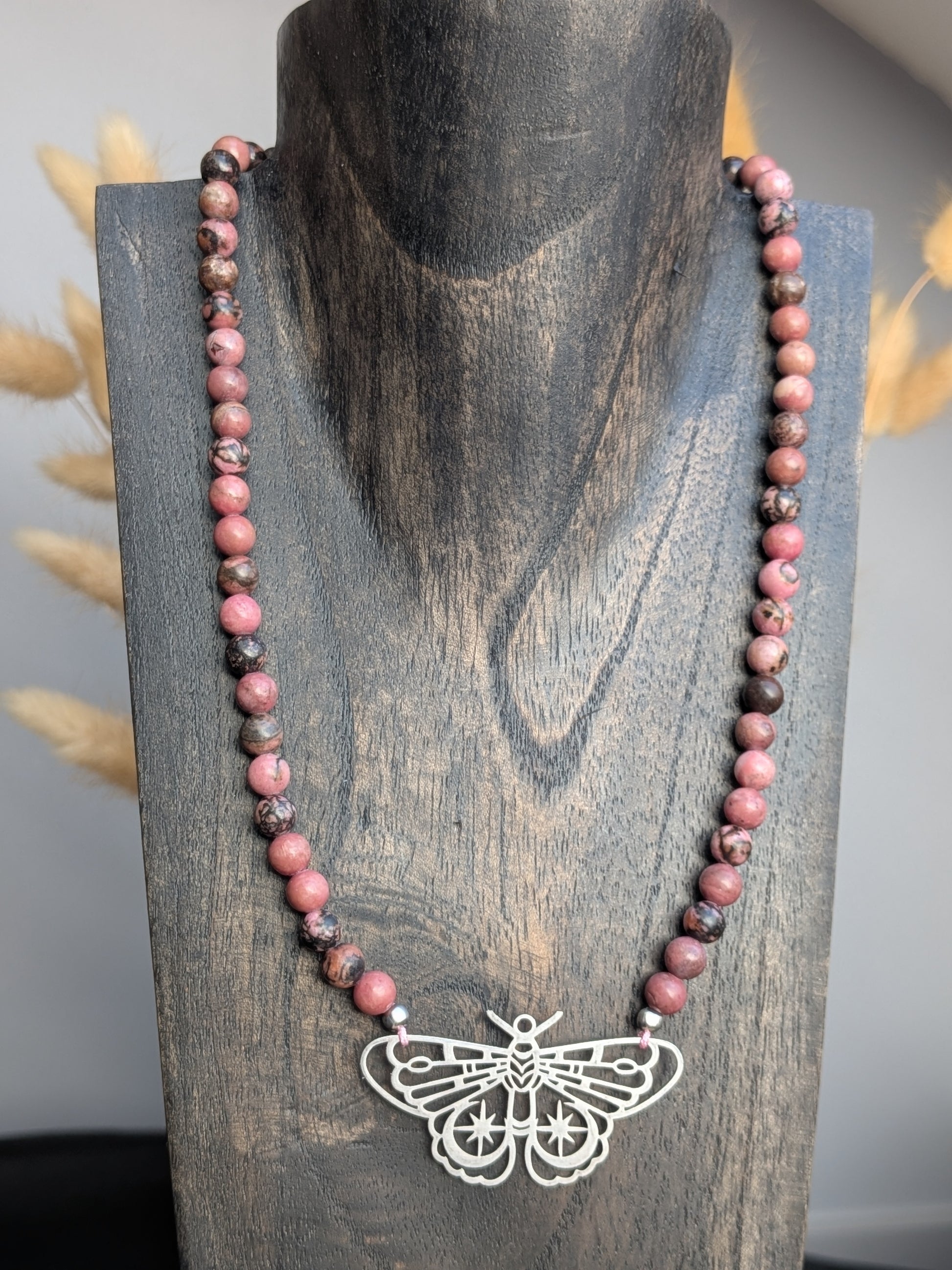 Les perles de rhodonite de 6 mm, aux nuances de rose marbré de noir, apportent une touche à la fois féminine et authentique. Le papillon, symbole de transformation et de renouveau, vient sublimer l’ensemble avec finesse.
