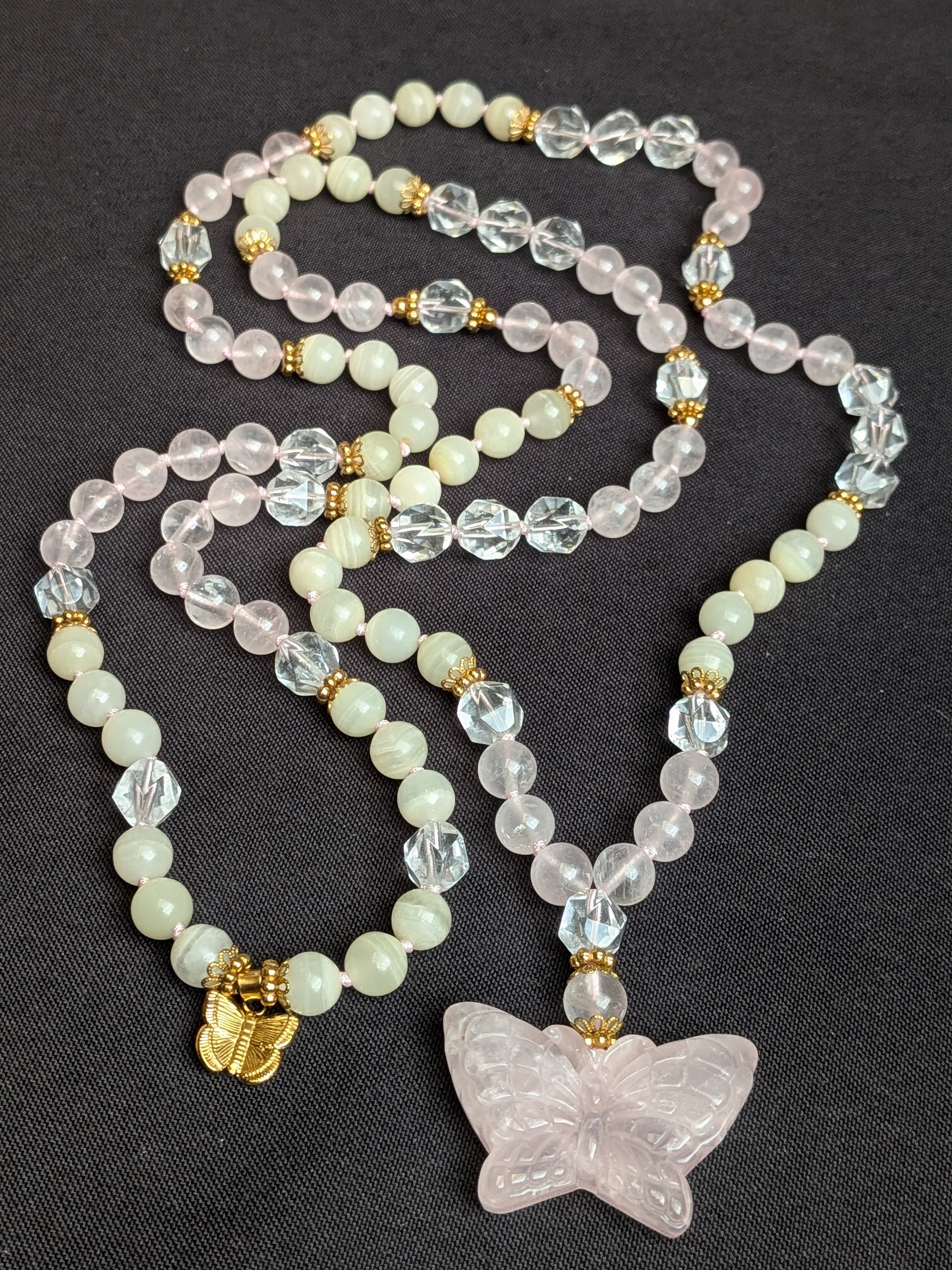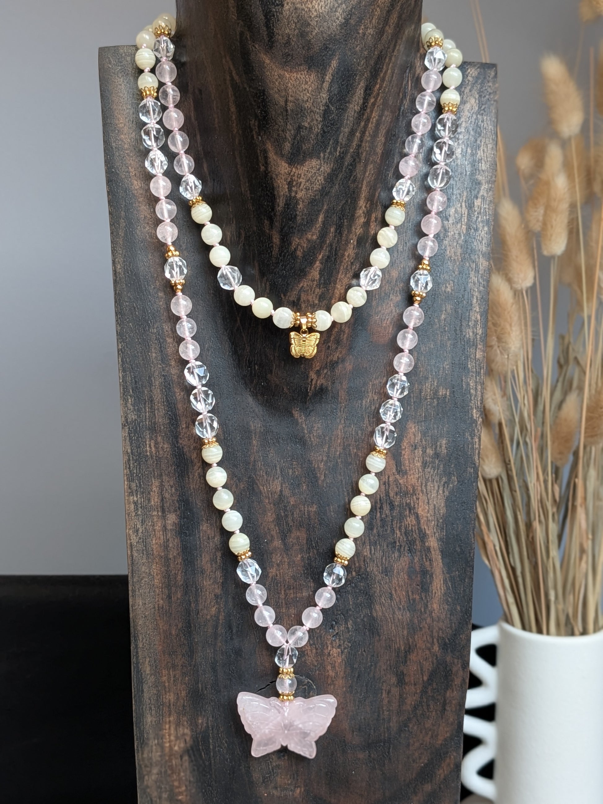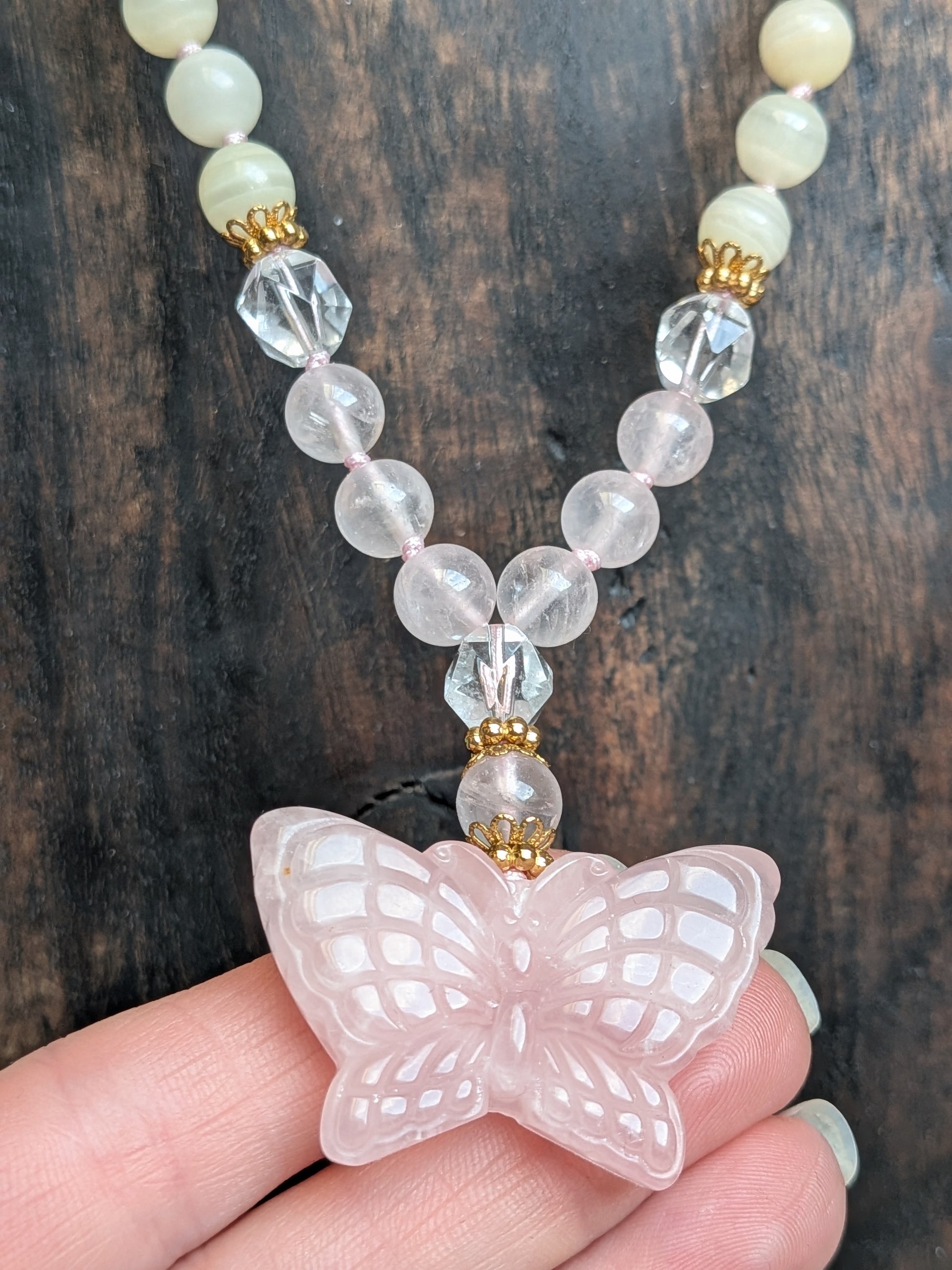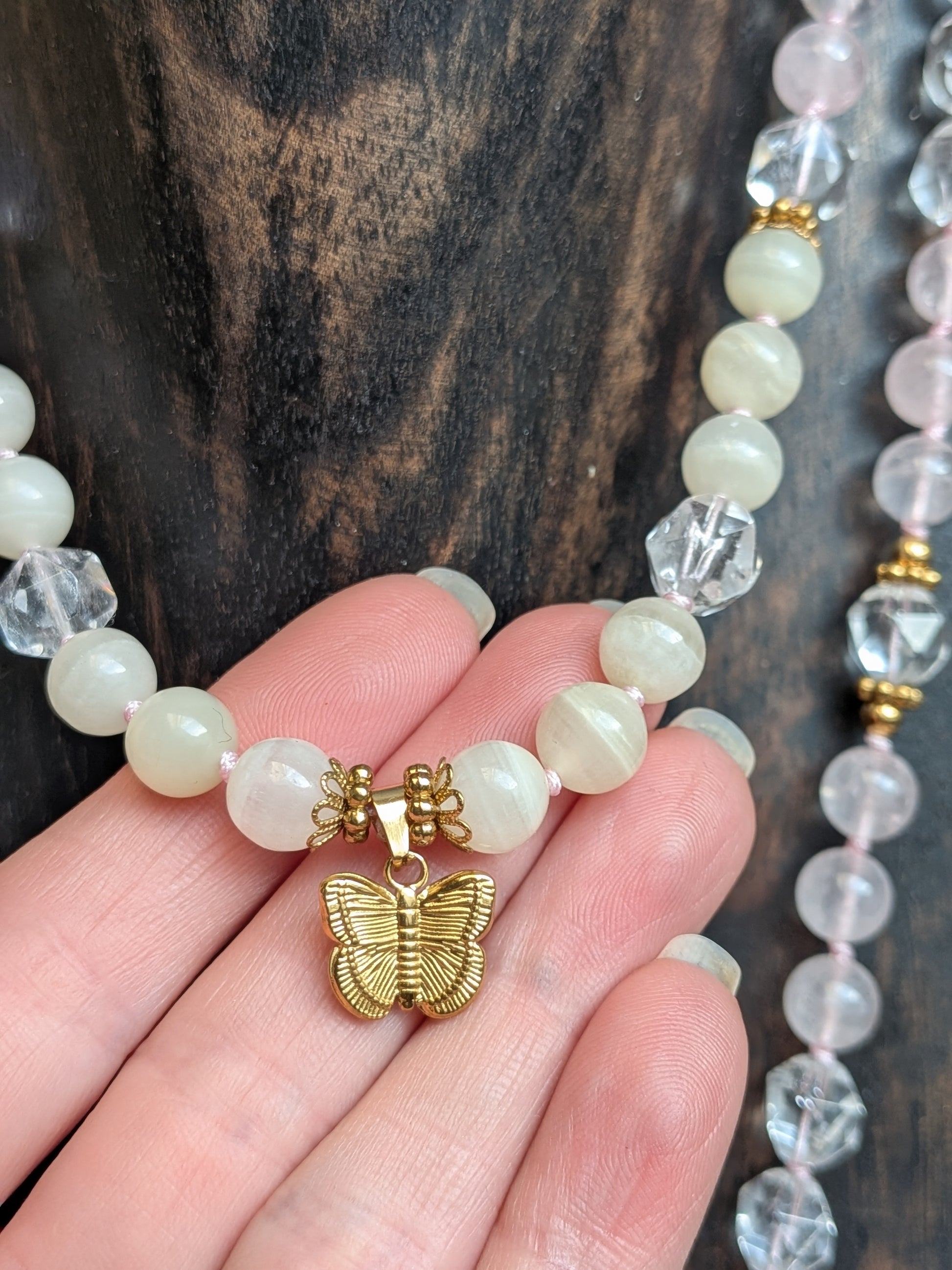 Quartz rose • Calcite verte • Cristal de roche • Papillon en quartz rose