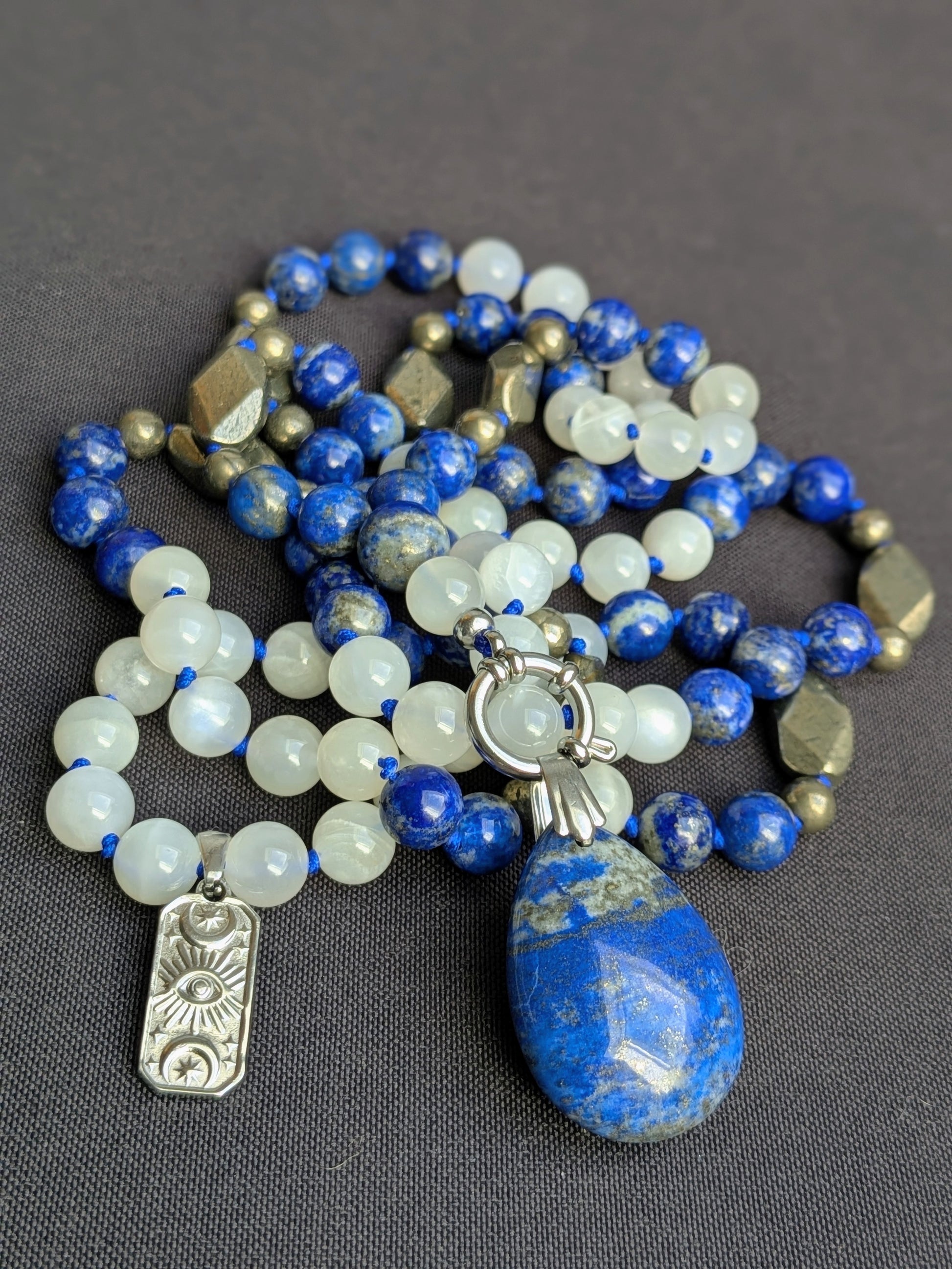 🌛 Mala en lapis-lazuli, pierre de lune blanche et pyrite, créé autour de l’énergie du Féminin Sacré.