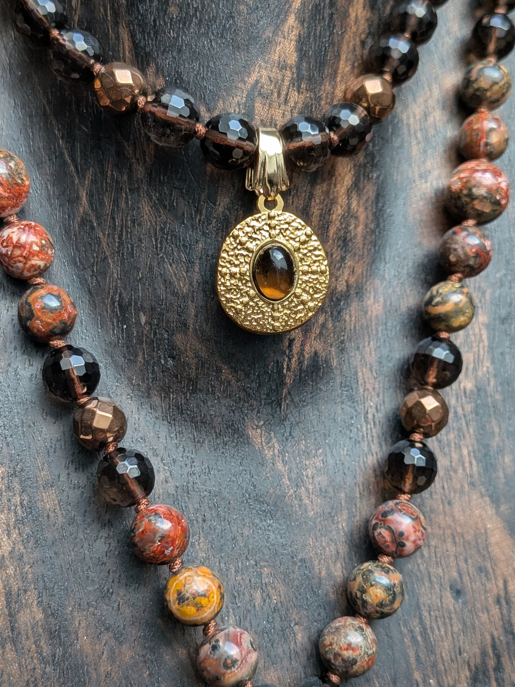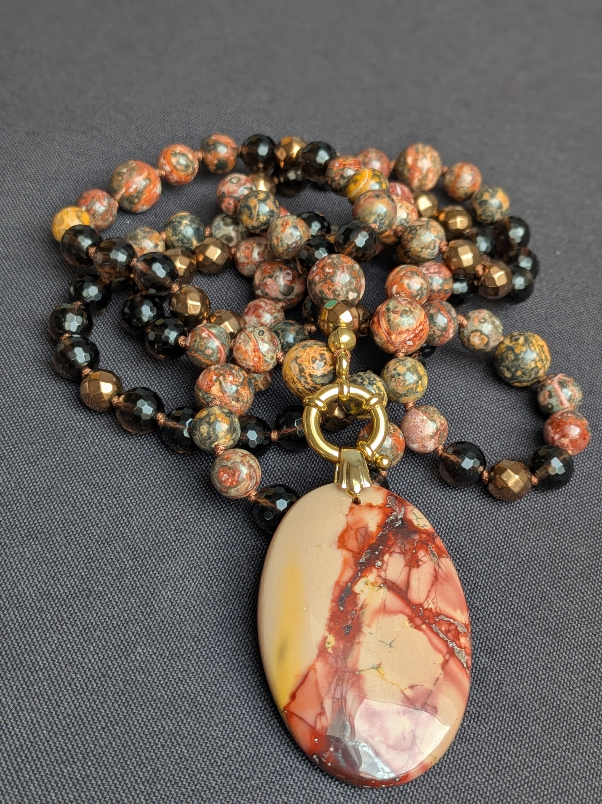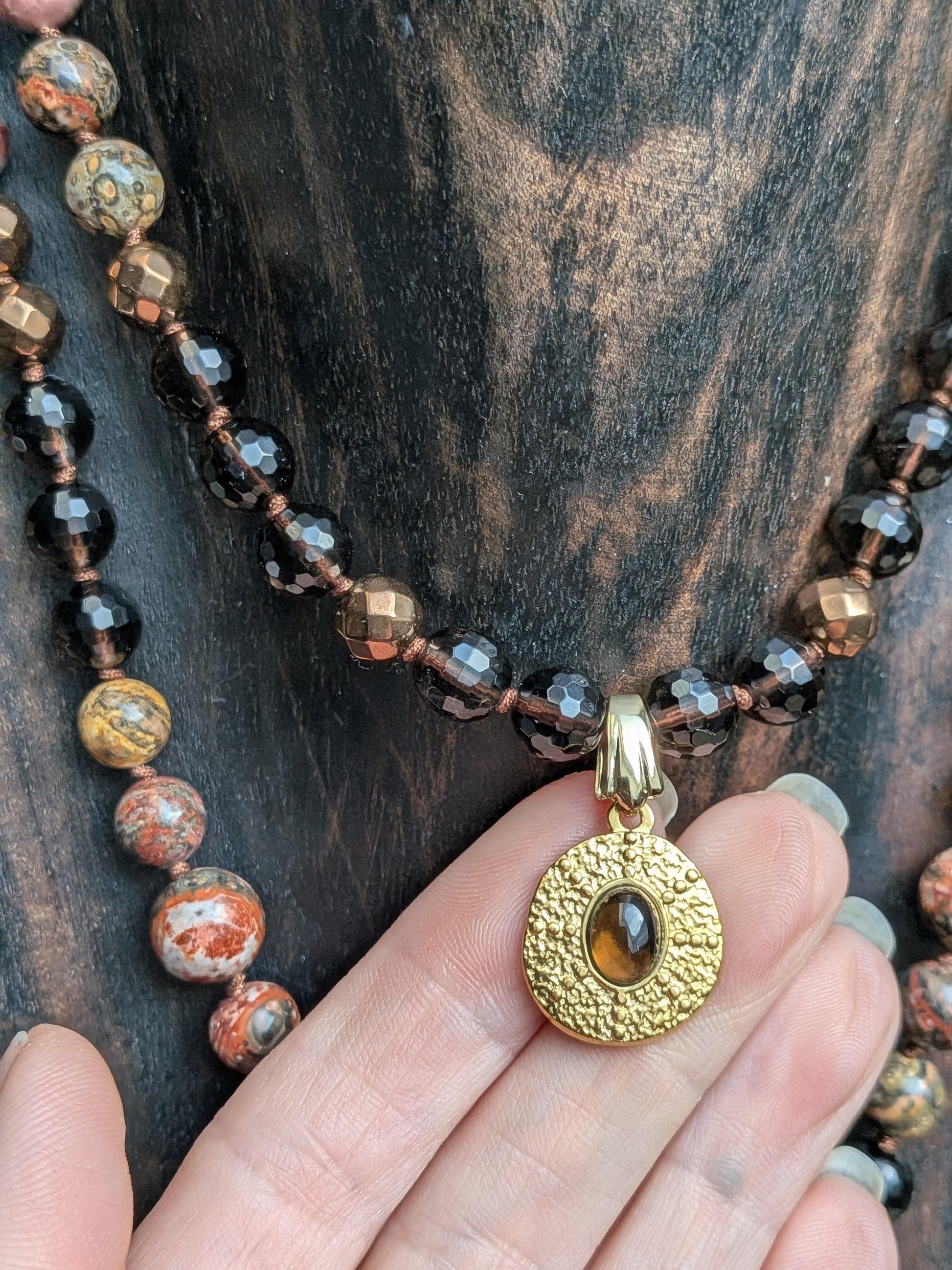 Jaspe léopard • Quartz fumé facetté • Hématite cuivrée • Mokaïte