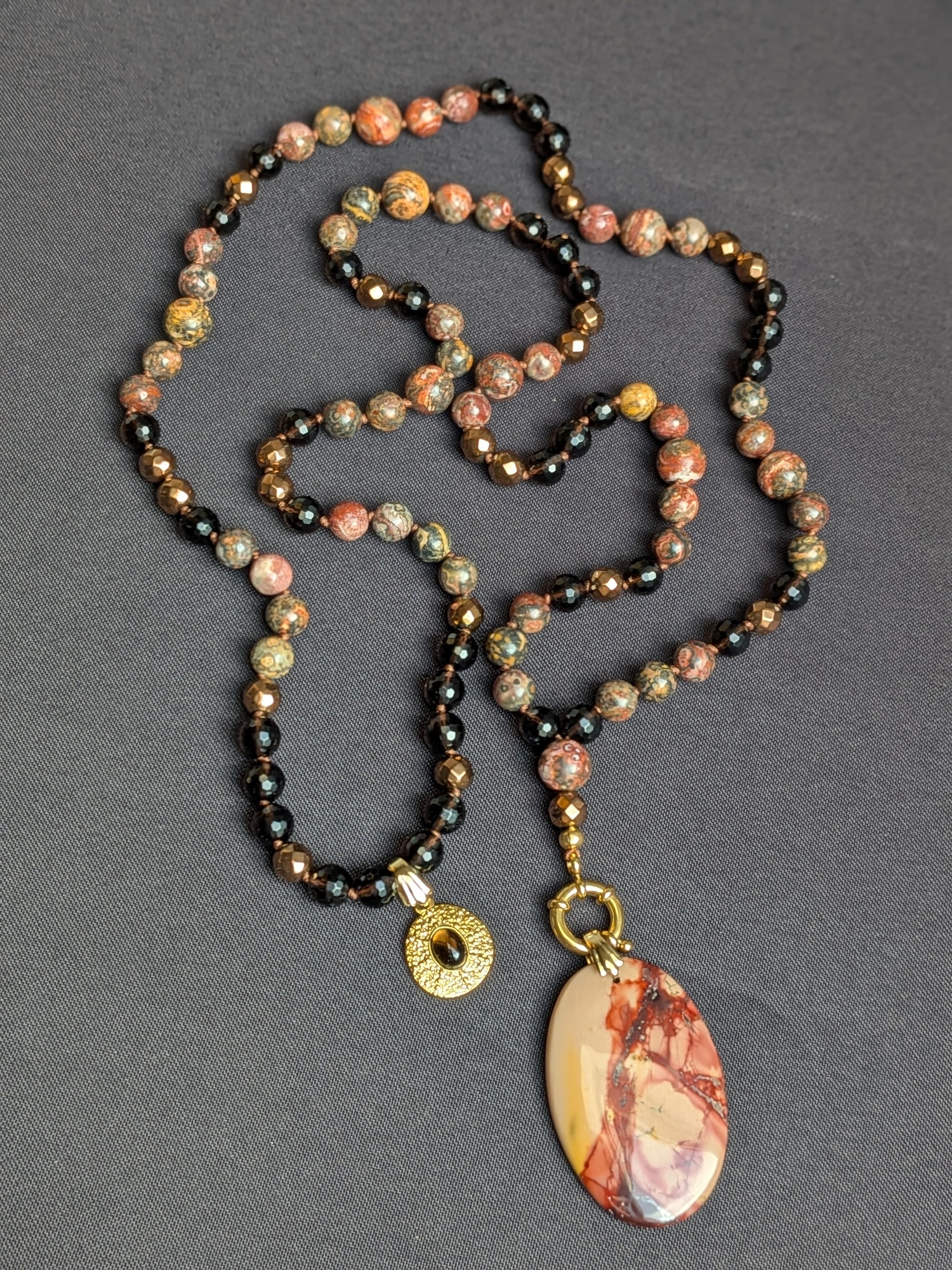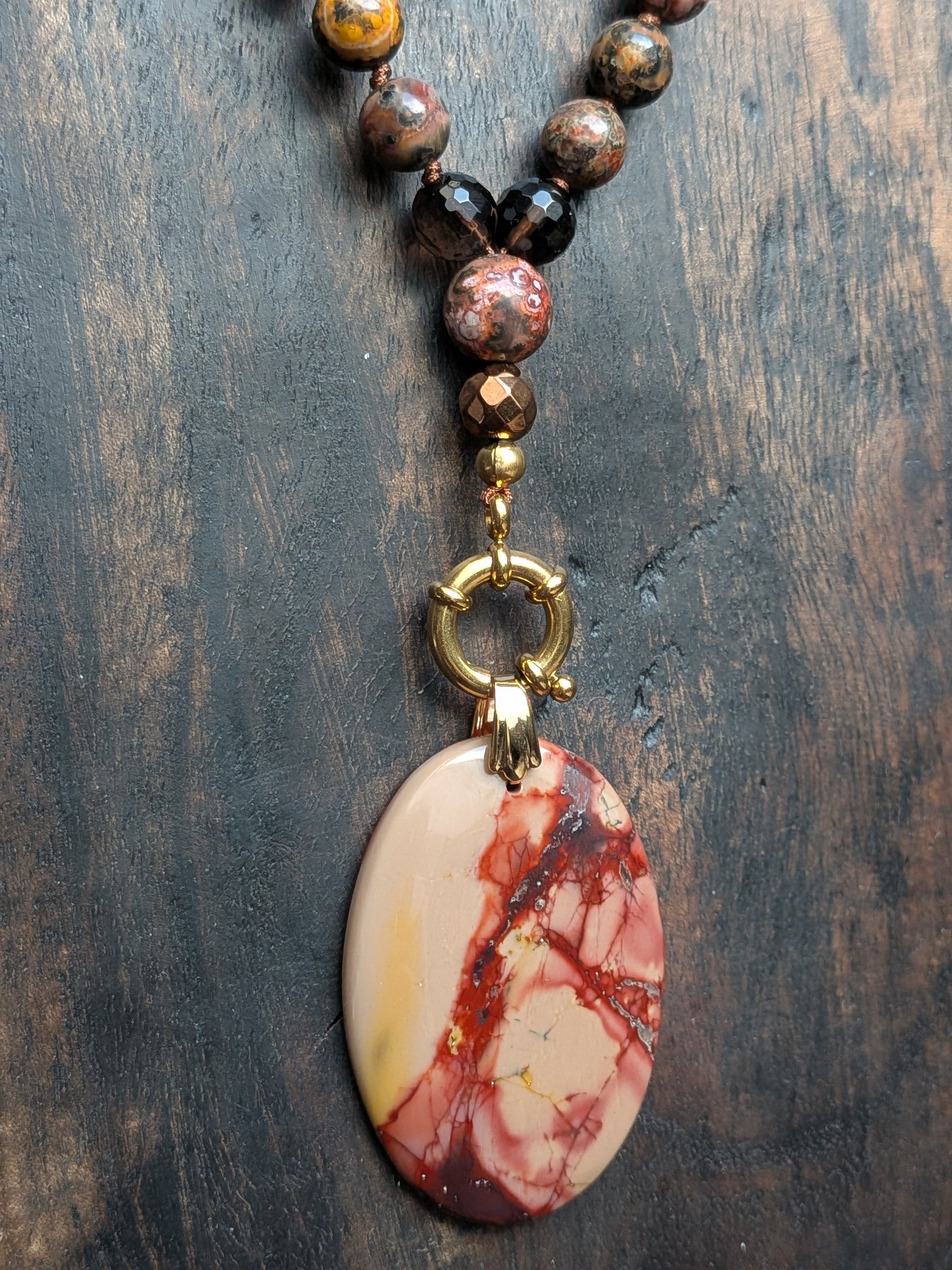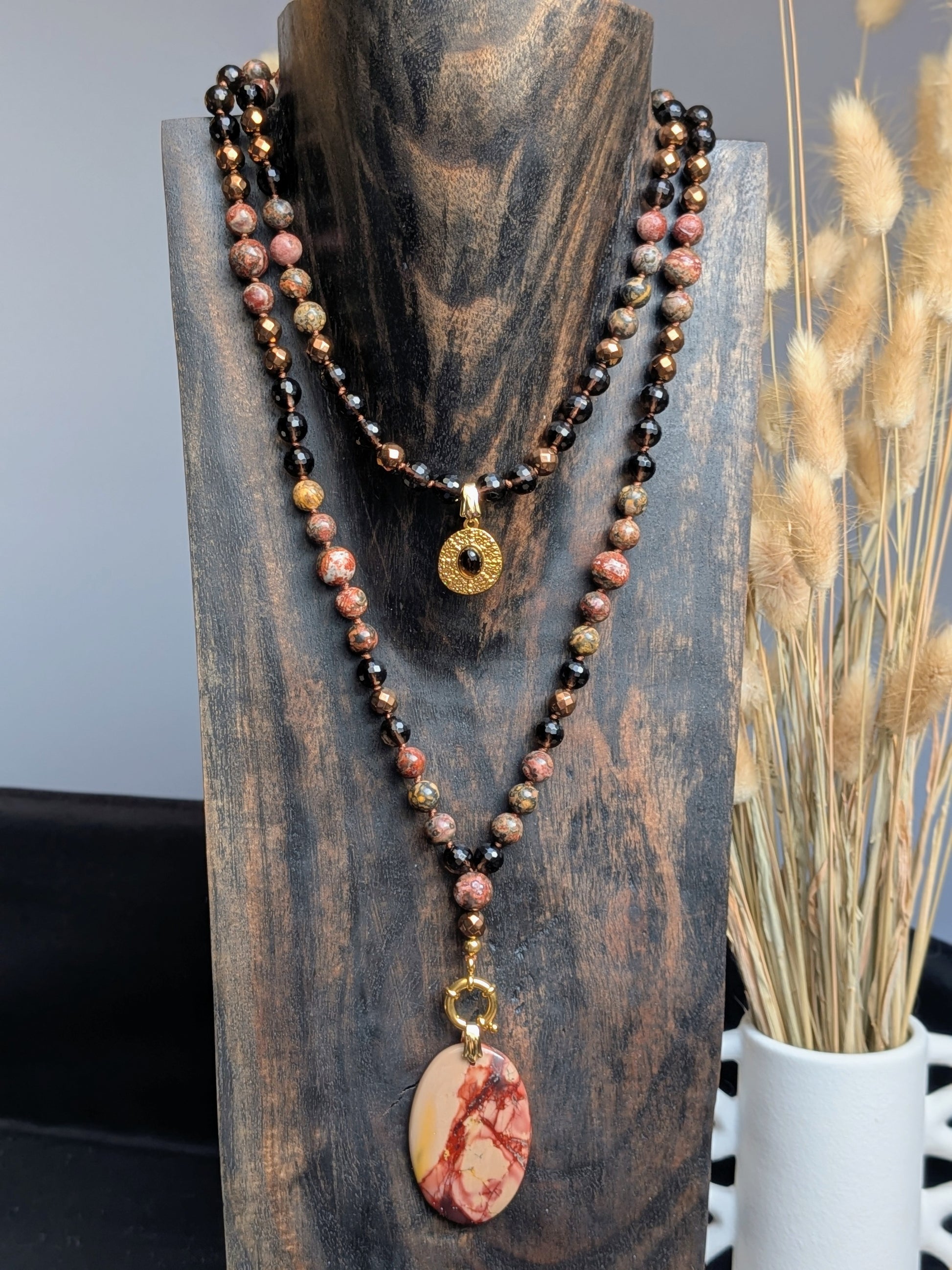 Jaspe léopard • Quartz fumé facetté • Hématite cuivrée • Mokaïte