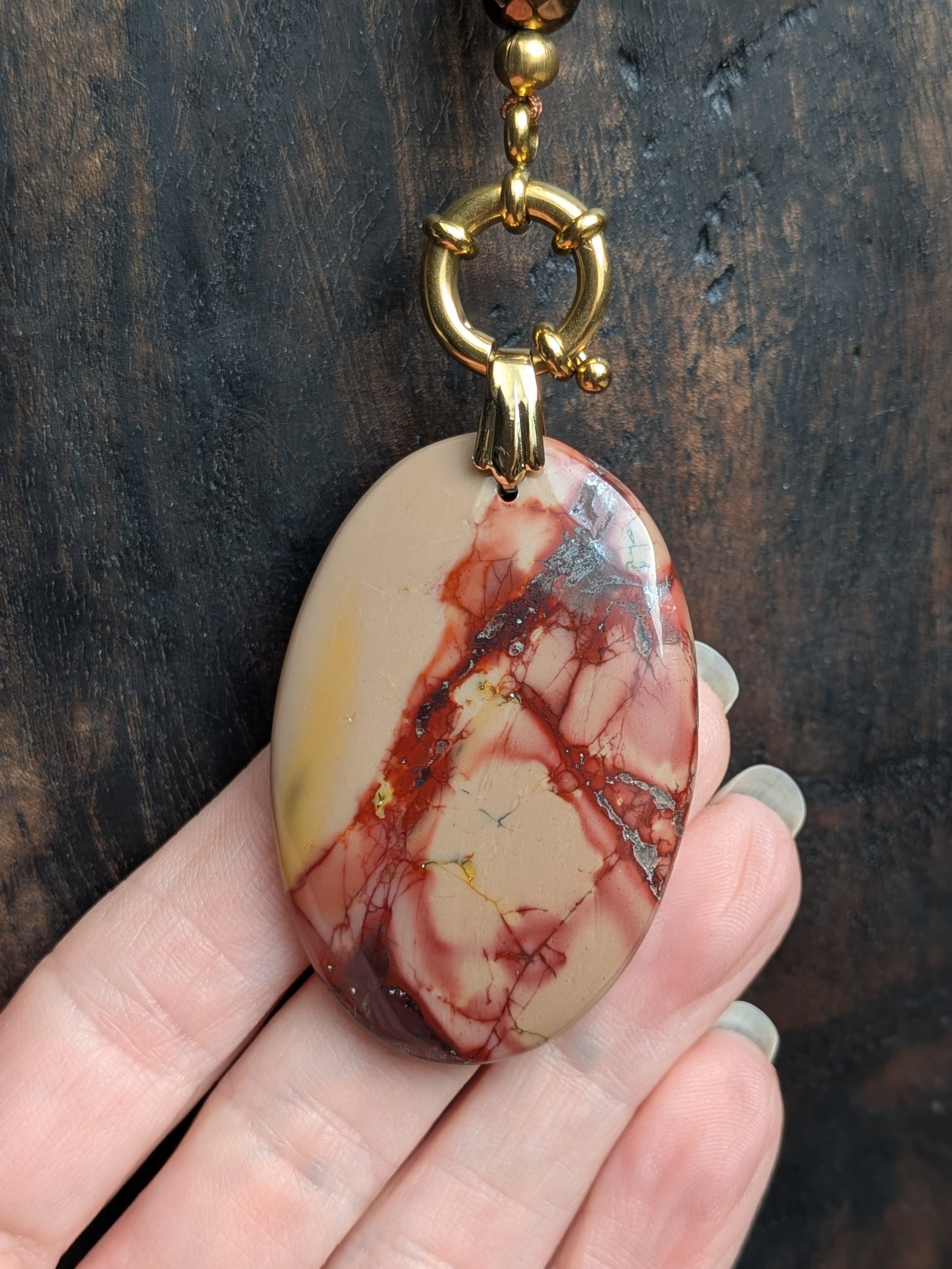 Le pendentif en Mokaïte, aux teintes chaudes et désertiques, évoque la sagesse de la Terre et l’élan d’avancer.