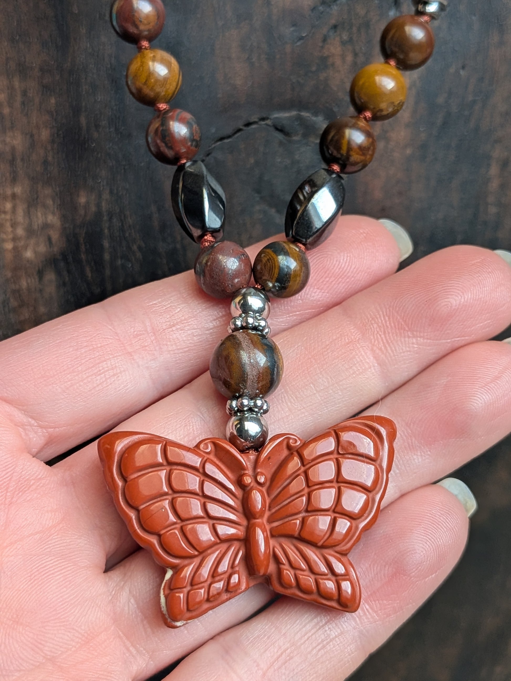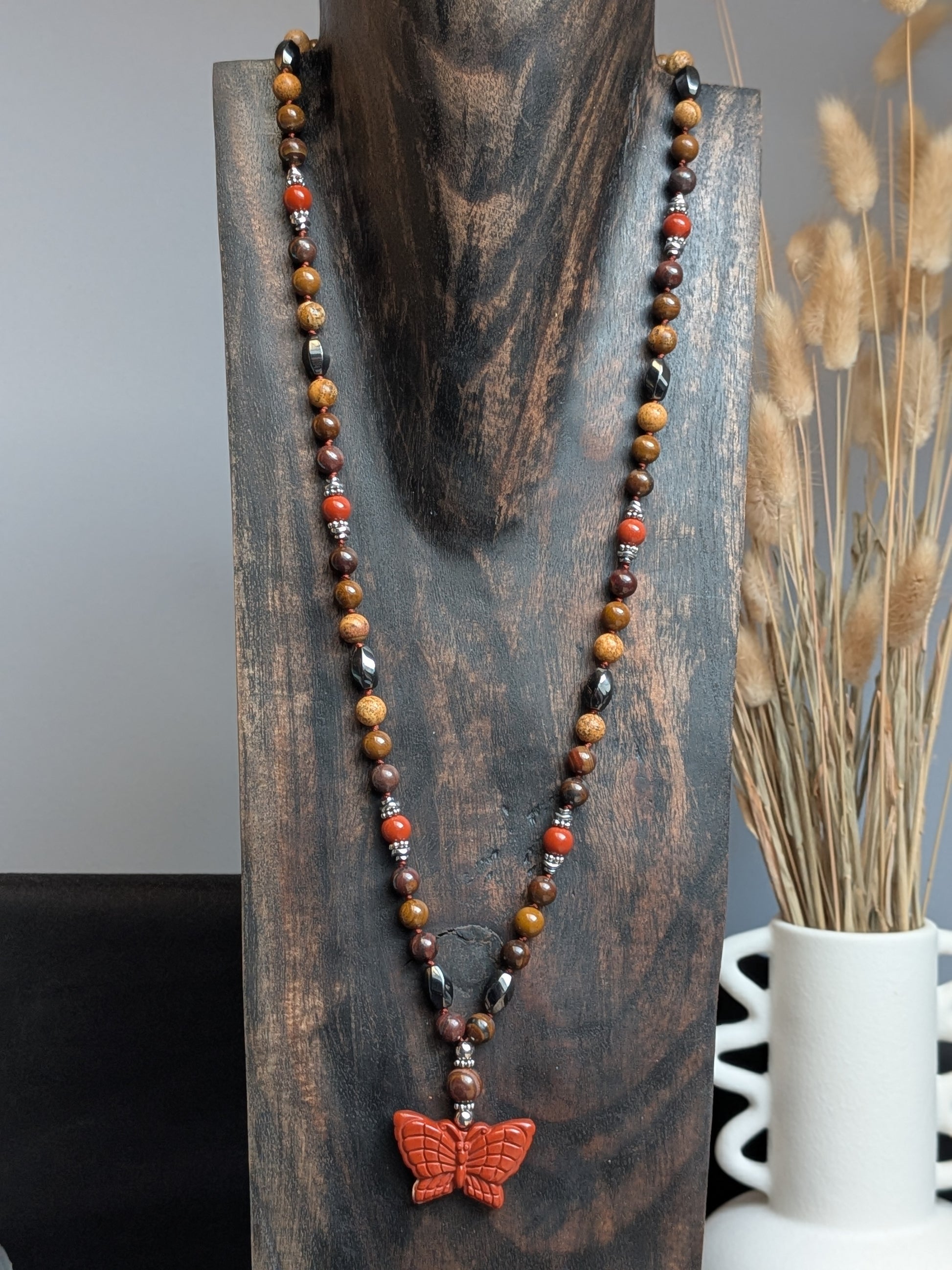 Le pendentif papillon en Jaspe rouge apporte une touche de renouveau et symbolise le pouvoir de la métamorphose.