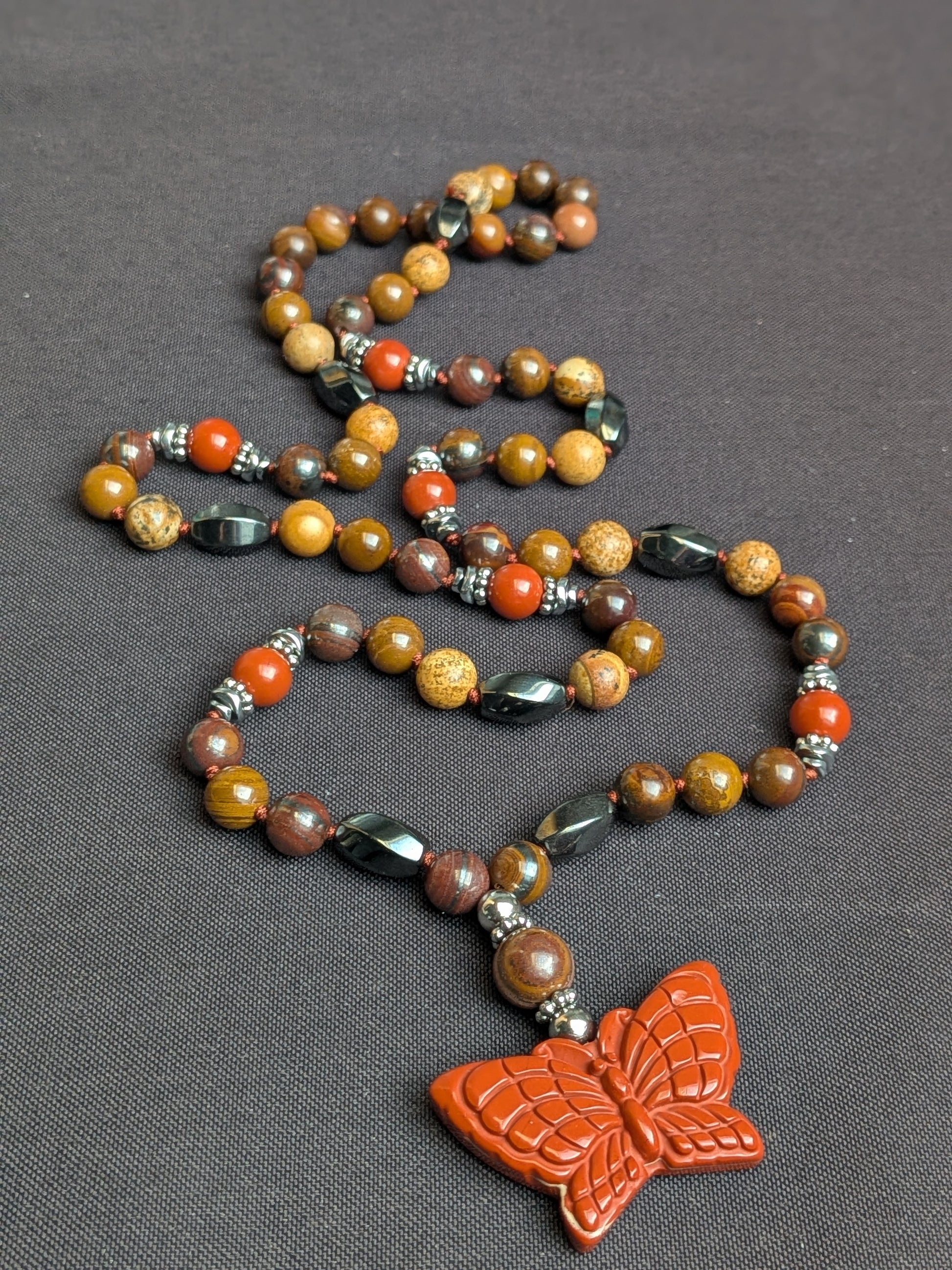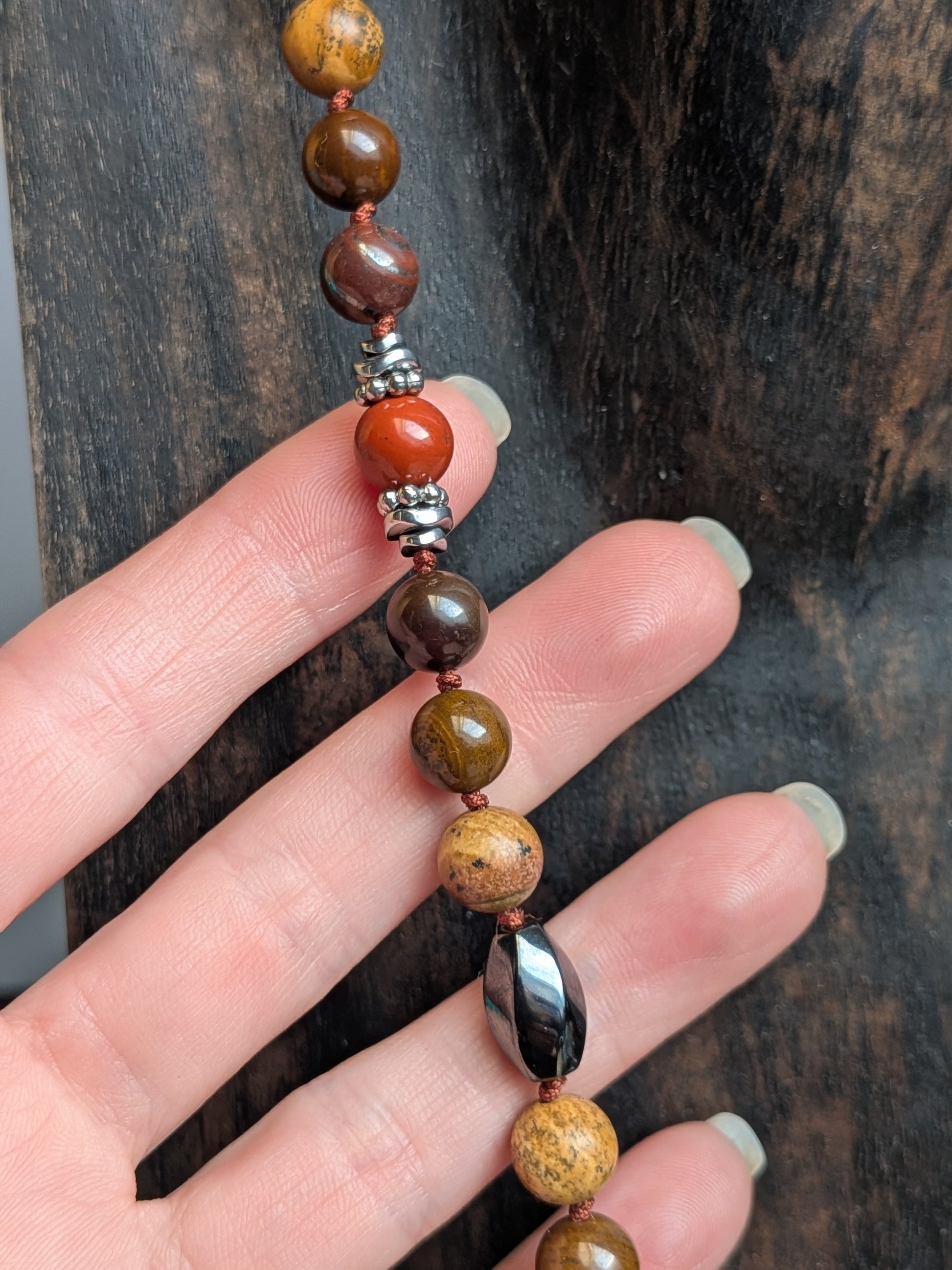 Un collier unique composé d’Œil de fer, de Jaspe paysage et de Jaspe rouge, pour l’ancrage, la force intérieure, la vitalité et la transformation.